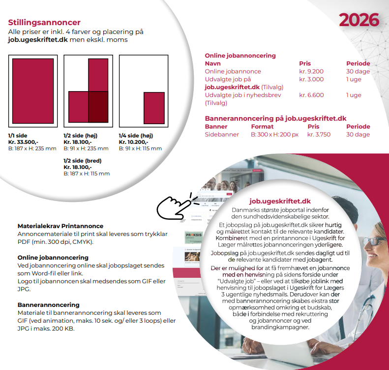 Vi tilbyder en række attraktive jobpakker hvor du rammer både de aktivt jobsøgende, som besøger job.ugeskrifte.dk hver måned, og de passivt jobsøgende, som læser Ugeskrift for Læger og Ugeskriftets ugentlige nyhedsbreve.